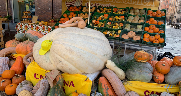 in piazza Stradivari a CremonaCon l’esposizione di zucche giganti,