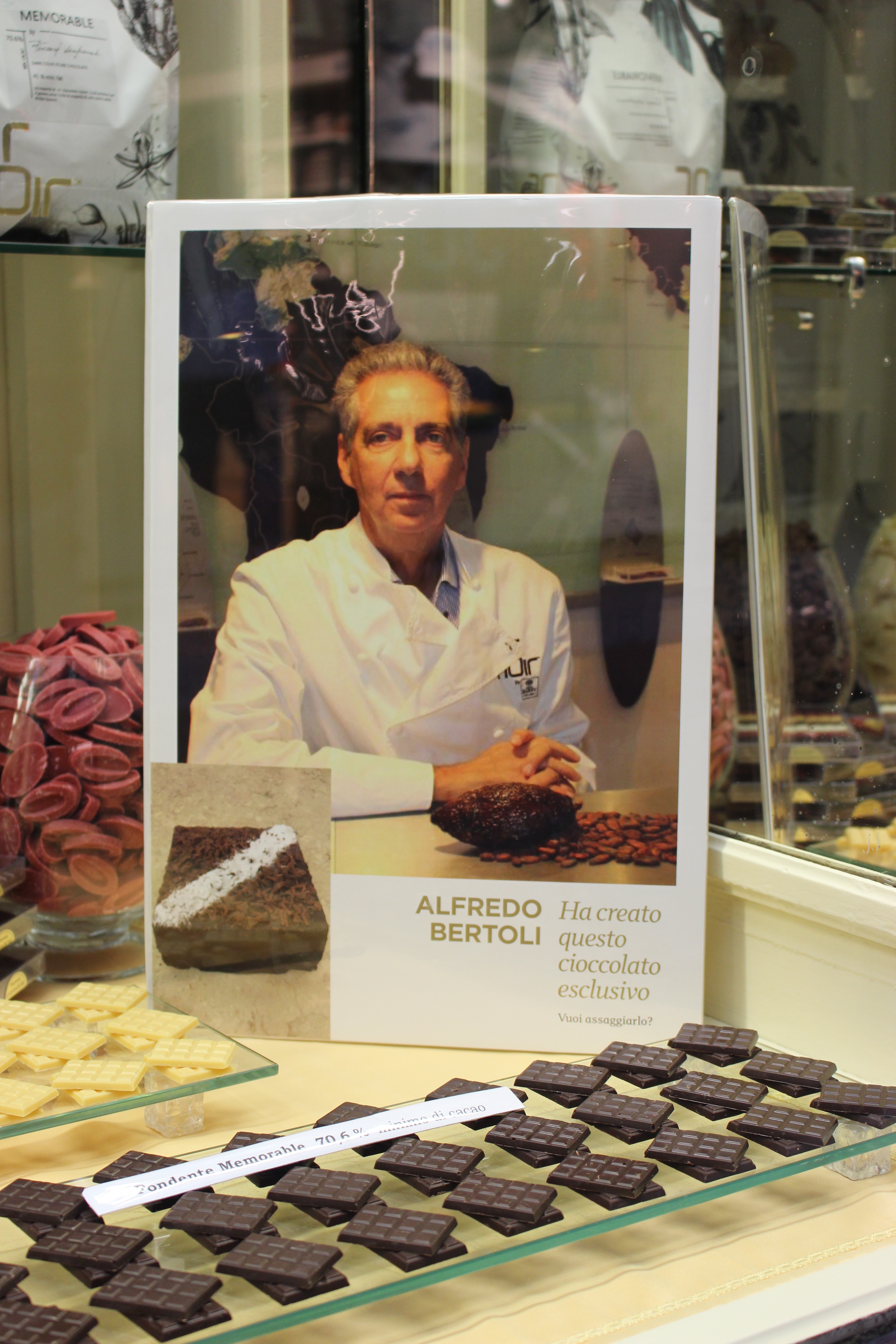 Questo cioccolato unico al mondo è stato creato alla celebre Accademia del Cioccolato Barry Callebaut, dove Alfredo Bertoli con il primo pasticcere hanno trascorso un’intera giornata per scoprire tutti i segreti del cioccolato e sviluppare la loro formula. Infatti hanno potuto per prima cosa assaggiare tre diversi cioccolati monorigine (provenienti rispettivamente dal Madagascar, dalla Tanzania e dal Perù), ciascuno con specifiche caratteristiche e percentuali molto alte di cacao. Dopo tre prove i tre cioccolati sono stati, dunque, dosati per realizzare un unicum mai composto prima, con una base di 70,6% di cacao amaro, che al gusto rivela un sapore davvero particolare, con una base equilibrata né troppo affumicata, né troppo amara. Per un cioccolato così serviva un nome che lasciasse il segno ed ecco creato per tutti voi “Memorable”.